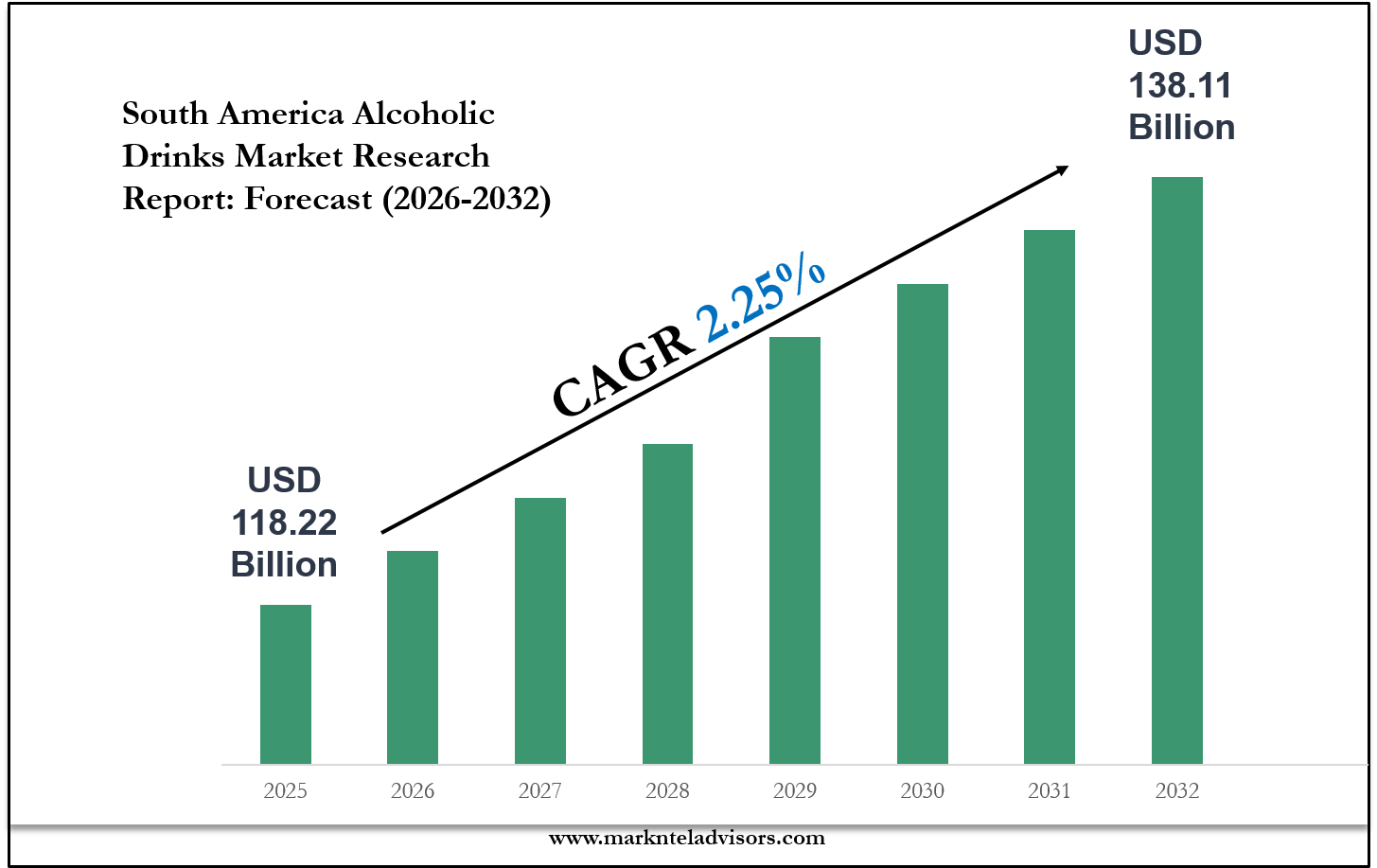 The South America Alcoholic Drinks Market size is valued at around USD 118.22 billion in 2025 and is expected to reach USD 138.11 billion by 2032. Along with this, the market is estimated to grow at a CAGR of around 2.25% during the forecast period, i.e., 2026-32.