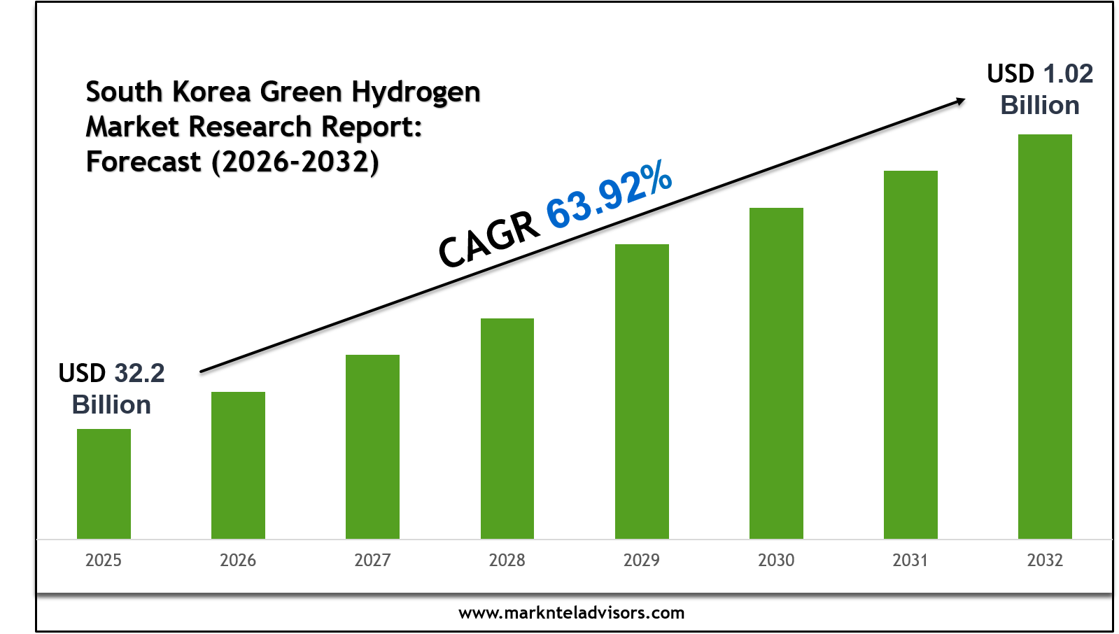 The South Korea Green Hydrogen Market size is valued at around USD 32.20 million in 2025 and is projected to reach USD 1,024.15 million by 2032. Along with this, the market is estimated to grow at a CAGR of around 63.92% during the forecast period, i.e., 2026-32.