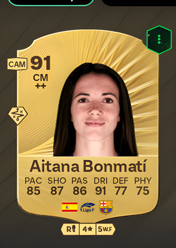 Aitana Bonmatí Conca's Gold Rare card shines as a Center Midfielder with an impressive overall rating of 91, boasting standout attributes such as 85 pace, 87 shooting, 86 passing, 91 dribbling, 77 defense, and 75 physicality. As a central presence on the pitch, Bonmatí's card offers a perfect blend of agility, technical skill, and attacking prowess, making her a dynamic playmaker who can dictate the flow of the game. Her exceptional dribbling and passing ratings enable her to orchestrate attacks and break through defensive lines, while her solid shooting ensures she's a constant threat near goal. With this card, players can count on Bonmatí to control the midfield, create scoring opportunities, and provide the stability needed to dominate matches.