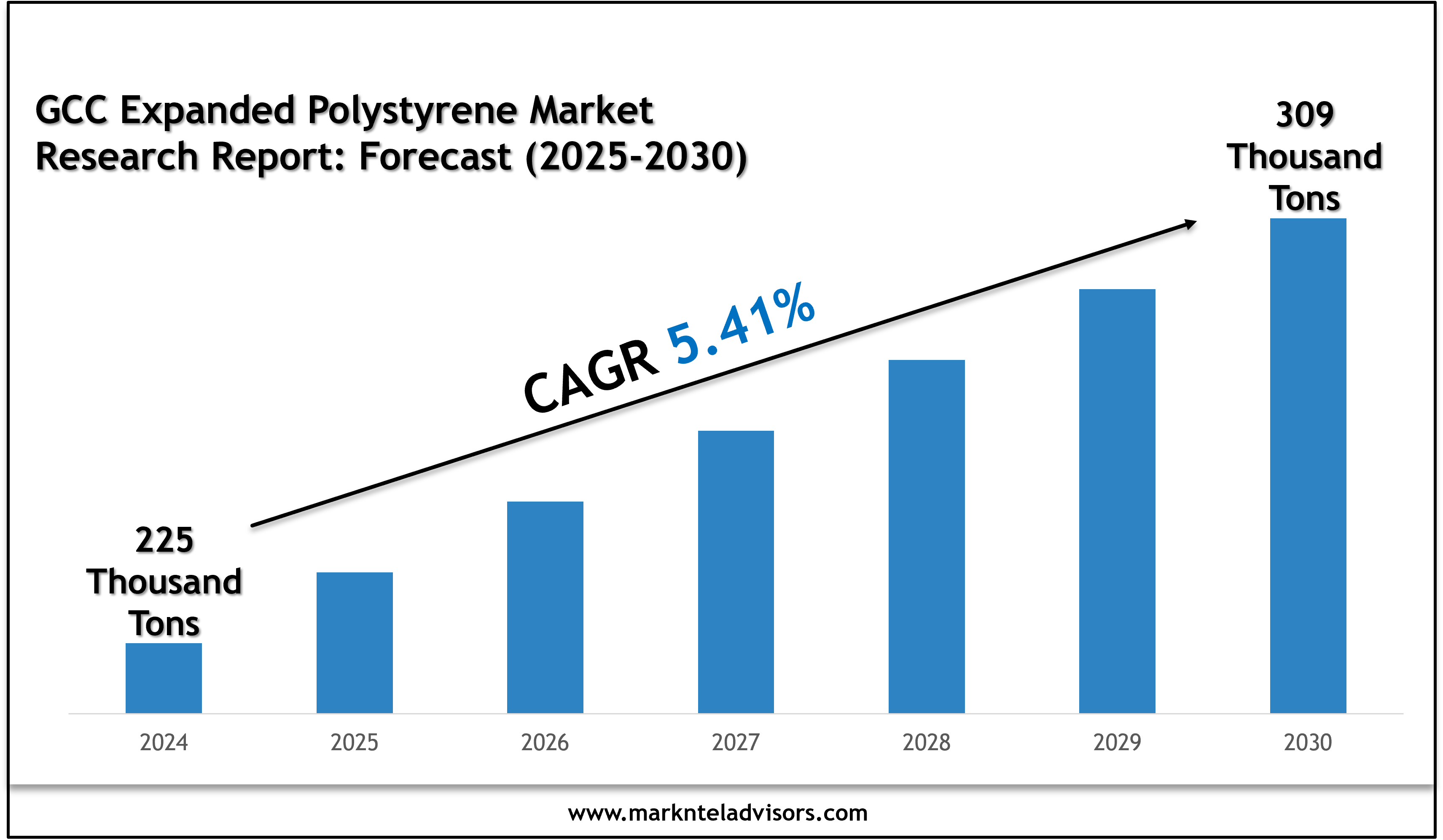 The GCC Expanded Polystyrene Market size was valued at around 225 Thousand Tons in 2024 and is projected to reach 309 Thousand Tons by 2030. Along with this, the market is estimated to grow at a CAGR of around 5.41% during the forecast period, i.e., 2025-30.