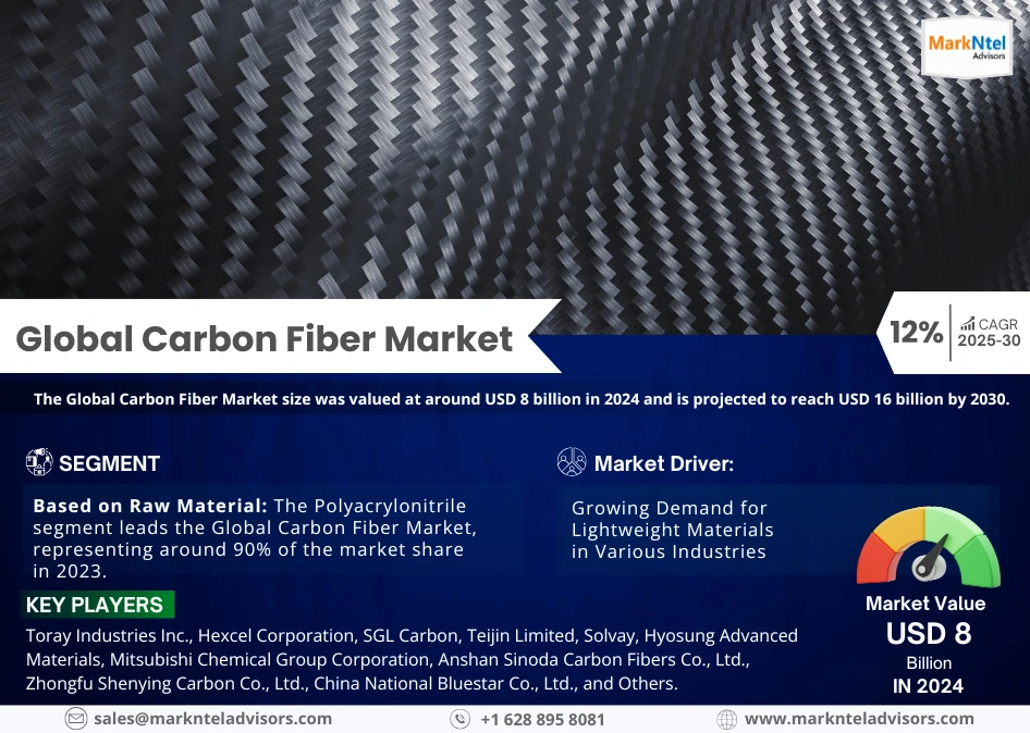 As per MarkNtel The Global Carbon Fiber Market size was valued at around USD 8 billion in 2024 and is projected to reach USD 16 billion by 2030. Along with this, the market is estimated to grow at a CAGR of around 12% during the forecast period, i.e., 2025-30.