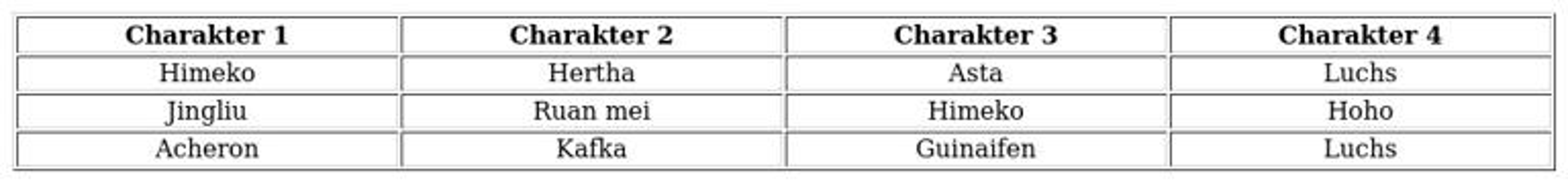 Bei der Zusammenstellung Ihrer Mannschaft empfiehlt es sich, auf bewährte Helden wie Kafka, Schwarzer Schwan und Hoho zu setzen. Aufgrund der besonderen Herausforderungen der jeweiligen Etappen ist es ratsam, ein Team zu bilden, das auf Dot-Schaden spezialisiert ist, ergänzt durch einen „Batterie“-Charakter wie Hoho oder Tingyun, um die Teamleistung zu maximieren.