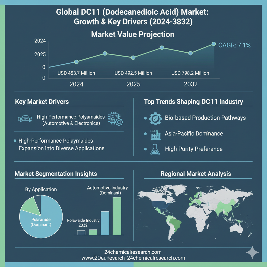 Global market for DC11 (Dodecanedioic Acid), a critical chemical intermediate, was valued at USD 453.7 million in 2024, according to industry analysis. Projections indicate strong growth, with the market expected to climb from USD 492.5 million in 2025 to USD 798.2 million by 2032, exhibiting a steady compound annual growth rate (CAGR) of 7.1%. This expansion is primarily attributed to sustained demand from the polyamide sector and the compound’s increasing role in advanced industrial applications, supported by significant production capacity in key regions.