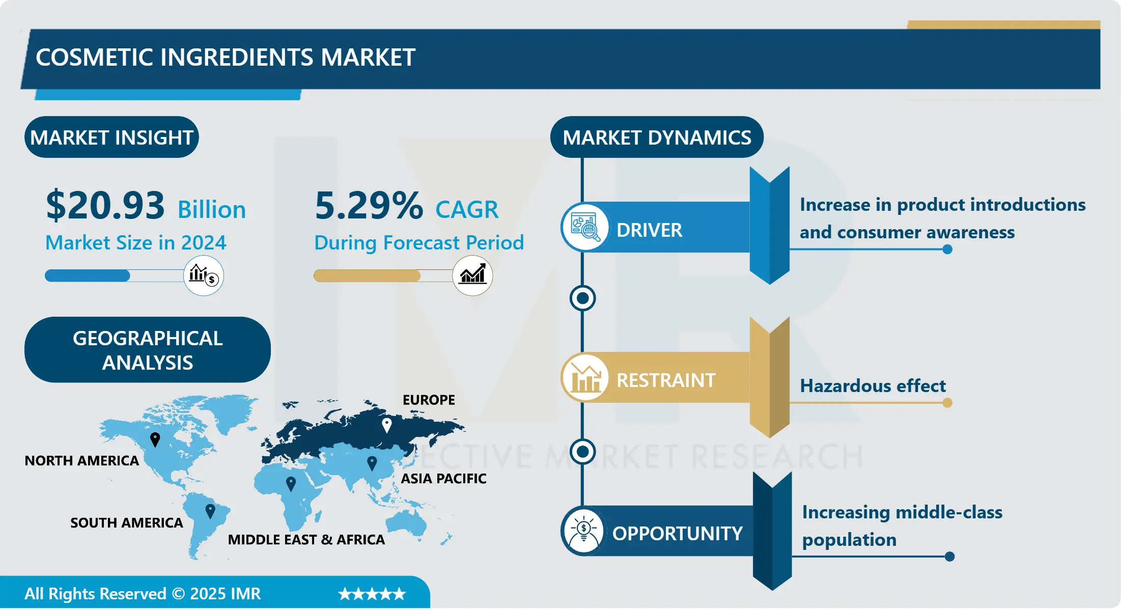 “According to a new report published by Introspective Market Research, Cosmetic Ingredients Market by Source (Natural, Synthetic), Ingredient Type (Active Ingredients, Preservatives, Emollients, Surfactants, and others), and Application (Skincare, Haircare, Makeup, and others), The Global Cosmetic Ingredients Market Size Was Valued at USD 20.93 Billion in 2024 and is Projected to Reach USD 31.61 Billion by 2032, Growing at a CAGR of 5.29%.”