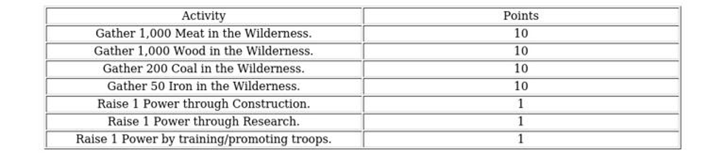 Points accumulated through promotional activities reflect the variance in troop training points specific to each level.