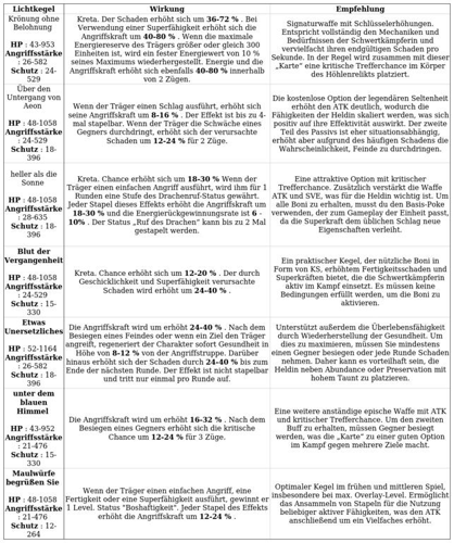 • Kritische Chance: 100 %, wobei während des Kampfes eine Erhöhung um 20 % gegenüber dem Basiswert möglich ist.