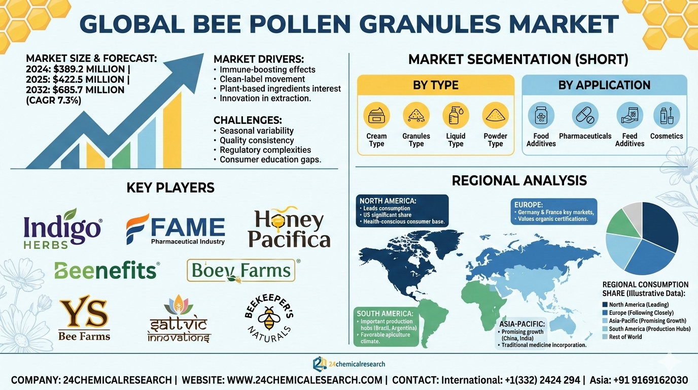 Global bee pollen granules market size was valued at USD 389.2 million in 2024. The market is projected to grow from USD 422.5 million in 2025 to USD 685.7 million by 2032, exhibiting a CAGR of 7.3% during the forecast period. While the market continues to