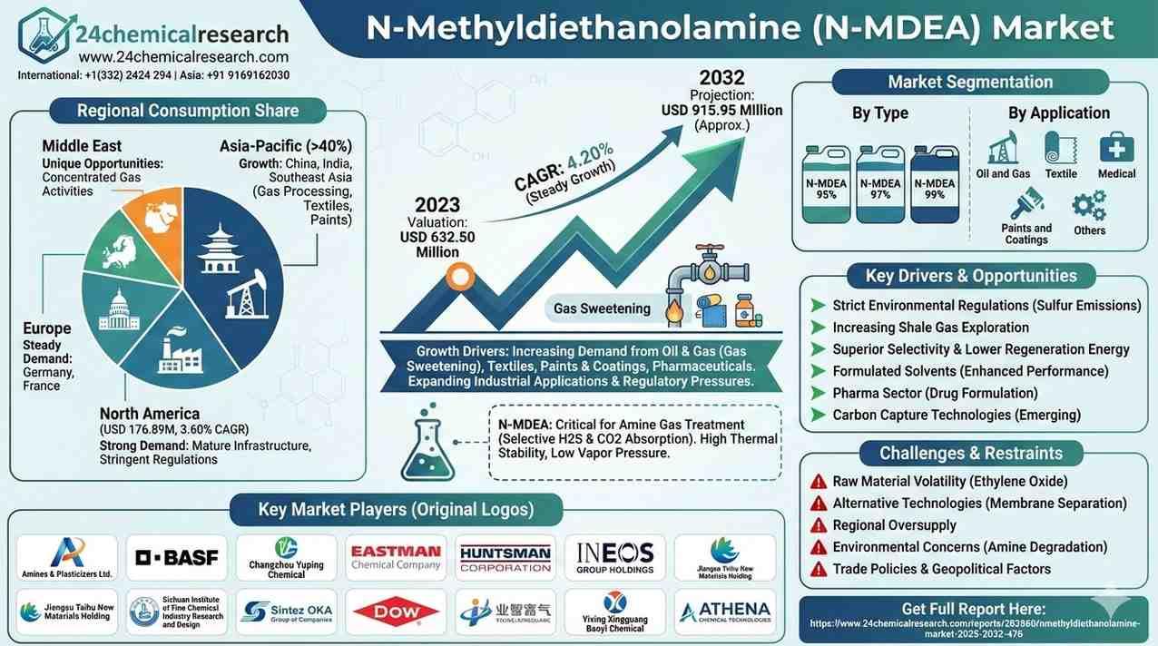 Global N-Methyldiethanolamine (N-MDEA) market continues to demonstrate steady growth, with its valuation reaching USD 632.50 million in 2023. According to the latest industry analysis, the market is projected to grow at a CAGR of 4.20%, reaching approximately USD 915.95 million by 2032. This growth is primarily driven by increasing demand from the oil & gas sector for gas sweetening applications, coupled with expanding industrial applications in textiles, paints & coatings, and pharmaceutical sectors.