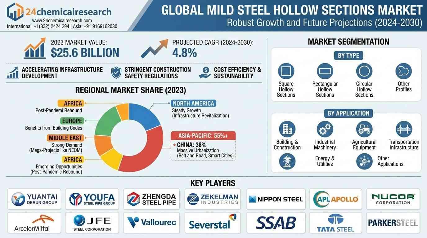 Global Mild Steel Hollow Sections Market demonstrated robust growth in 2023, valued at USD 25.6 billion, and is projected to expand at a CAGR of 4.8% through 2030. This upward trajectory is primarily driven by accelerating infrastructure development worldwide, stringent construction safety regulations, and the material's cost efficiency compared to alternatives like stainless steel or aluminum.
