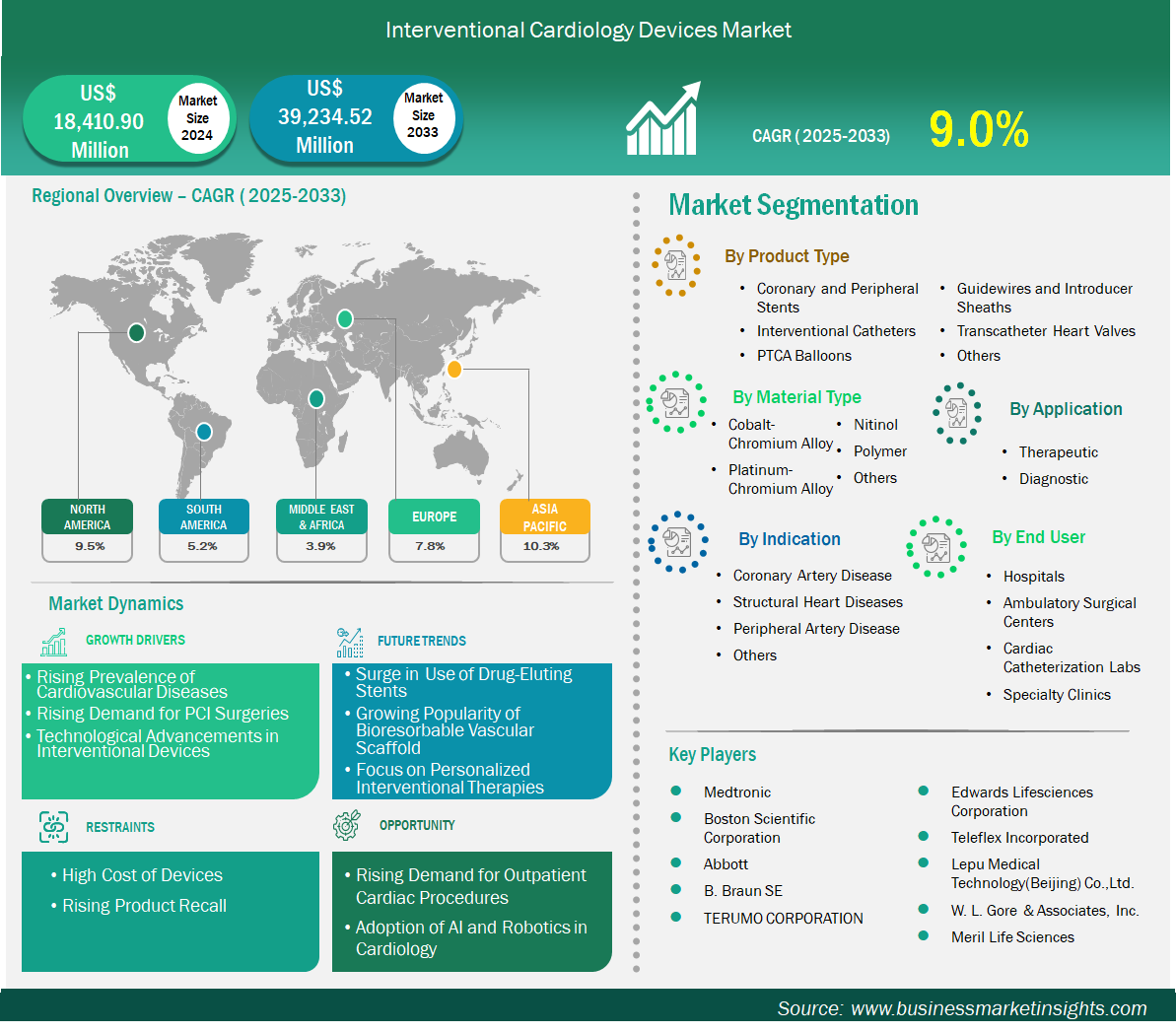 Abbott, Medtronic, Boston Scientific, and Terumo Corporation lead with comprehensive portfolios spanning coronary, peripheral, and structural interventions. BIOTRONIK, Cardinal Health, and Koninklijke Philips N.V. innovate in stents, catheters, and imaging integration. Emerging players like Meril Life Sciences and Alvimedica contribute cost-effective solutions, particularly in Asia-Pacific markets. Strategic expansions, such as Boston Scientific's SYNERGY XD stent launch in Europe, underscore competitive dynamics.