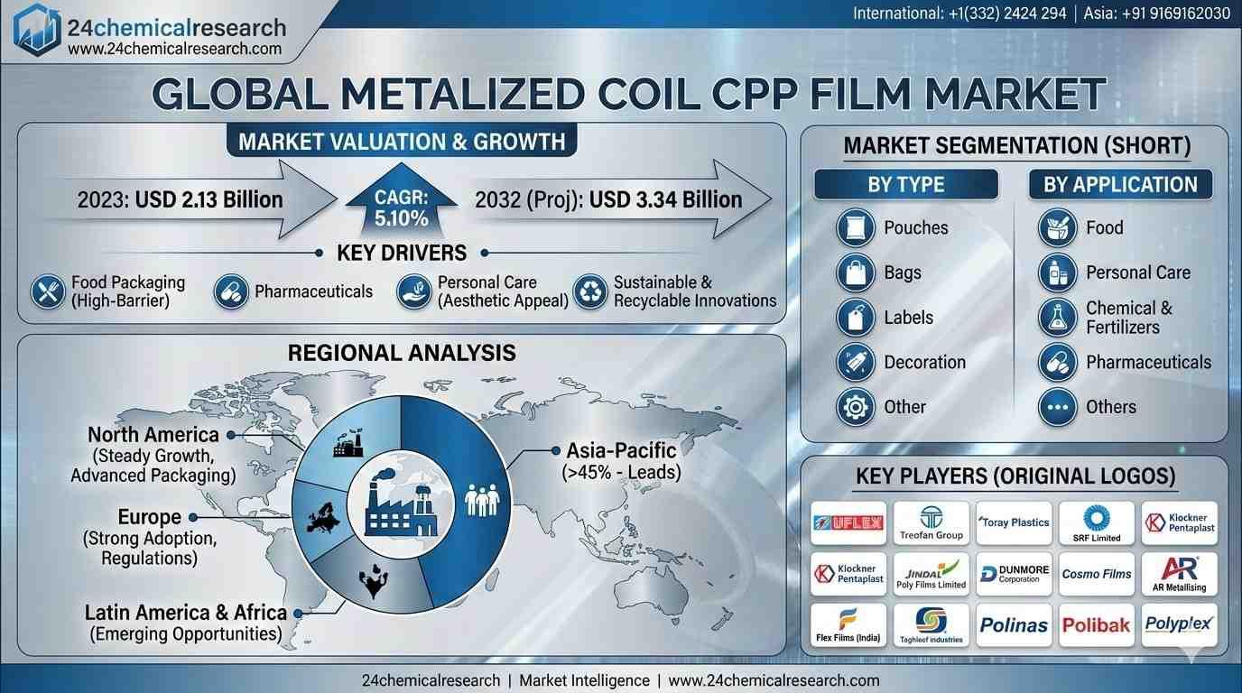 Global Metalized Coil CPP Film Market is experiencing substantial growth, with its valuation reaching USD 2.13 billion in 2023. According to comprehensive industry analysis, the market is projected to expand at a CAGR of 5.10%, reaching approximately USD 3.34 billion by 2032. This upward trajectory is primarily driven by increasing demand across food packaging, pharmaceuticals, and personal care sectors where high-barrier properties and aesthetic appeal are paramount.