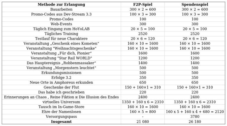 In einer übersichtlichen Tabelle sind alle Events und Geschenke aufgeführt, mit denen Spieler ihre Währung aufstocken können. Für eine bessere Vergleichbarkeit wurden alle Pässe in der Tabelle zu einem Verhältnis von 1:160 in Jades umgerechnet. Dabei werden die gesammelten Pässe separat von der Spielwährung ausgewiesen.