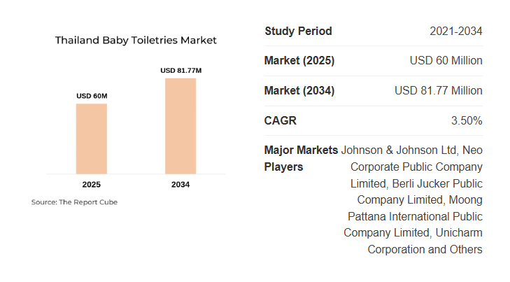 According to the Thailand Baby Toiletries Market Research Report (2026-2034) by Report Cube, the market was valued at approximately USD 60 Million in 2025. Based on current industry structure and observed demand patterns, the market is projected to reach USD 81.77 Million by 2034, expanding at a 3.50% CAGR during the forecast timeline.