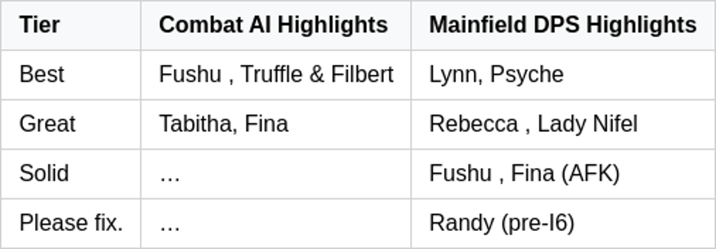 • Rankings generally exclude I6 unless specifically mentioned, such as for Inifel or Rhythm Shine dupe strategies.