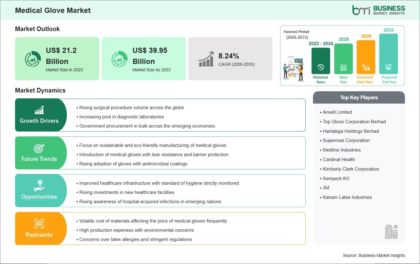 The Medical Glove Market is experiencing significant expansion due to increasing awareness of infection prevention, growing healthcare infrastructure, and rising surgical and diagnostic procedures worldwide. Medical gloves serve as a critical protective barrier between healthcare professionals and patients, reducing the risk of cross-contamination and transmission of infectious agents. The Medical Glove Market size is expected to reach US$ 39.95 billion by 2033 from US$ 21.20 billion in 2025, registering a compound annual growth rate (CAGR) of 8.24% from 2026 to 2033. The market’s growth is supported by stringent healthcare regulations, increasing global health awareness, and continuous innovation in glove materials and manufacturing technologies.