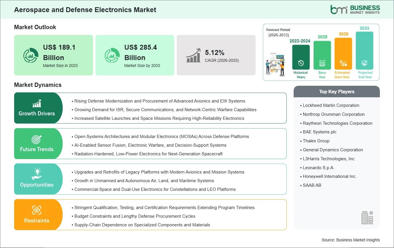 The Aerospace and Defense Electronics Market encompasses vital components like sensors, communication systems, radar, avionics, and electronic warfare solutions that power airborne, naval, land, and space platforms. Valued at US$ 189.10 billion in 2025, the sector is poised for steady growth at a 5.13% CAGR through 2033, reaching US$ 285.40 billion, driven by escalating global defense budgets and the integration of AI, UAVs, and next-gen radar technologies. Key segments include military applications (over 40% share in airborne platforms), commercial aerospace, and emerging space exploration, with embedded systems growing fastest at up to 9.63% CAGR due to autonomous systems demand.
