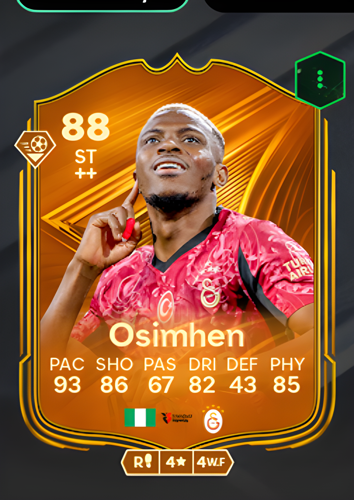Victor Osimhen’s Star Performer card stands out as a formidable Striker, boasting an impressive overall rating of 88. With blazing pace at 93 and a sharp shooting rating of 86, Osimhen is perfectly equipped to outrun defenders and finish chances with clinical precision. His dribbling rating of 82 allows for agile movement in tight spaces, while a robust physicality rating of 85 ensures he can hold off challenges and maintain possession under pressure. Although his passing and defense ratings are lower at 67 and 43 respectively, Osimhen’s attributes make him an ideal spearhead for your attack, capable of breaking through defensive lines and capitalizing on scoring opportunities to secure victory in crucial moments.