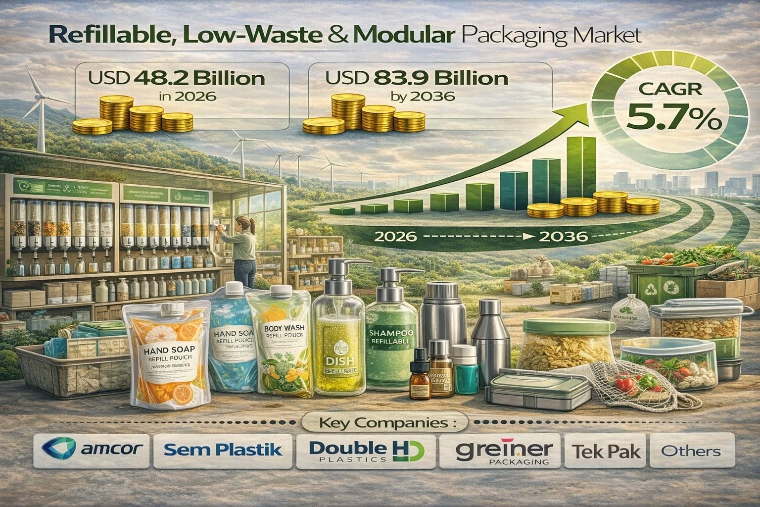 The Refillable, Low-Waste & Modular Packaging Market is undergoing a structural transformation as manufacturers pivot from single-use packaging toward precision-engineered modular systems that support controlled dispensing, refill functionality, and extended product lifecycles. The market is projected to reach USD 48.2 billion in 2026 and expand to USD 83.9 billion by 2036, advancing at a 5.7% CAGR during the forecast period. Growth reflects a global shift toward circular economy compliance, improved user convenience, and material-efficiency standards across consumer goods industries.