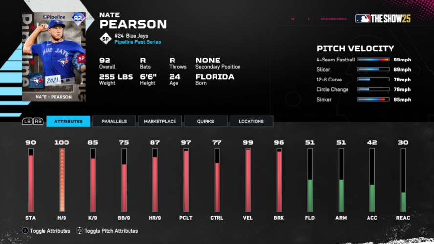 Now, let’s shift focus to pitching. Unlike hitting, pitching cards require a balance of pitch arsenal and control to truly excel. Even the best sequencing won’t save you if control stats and per-9s are lacking. This is where Nate Pearson stands out. His blazing fastball and deceptive 78 mph slow circle changeup keep batters guessing. Add in his sinker, slider, and 12-6 curveball, and you’ve got a pitcher who can dominate.