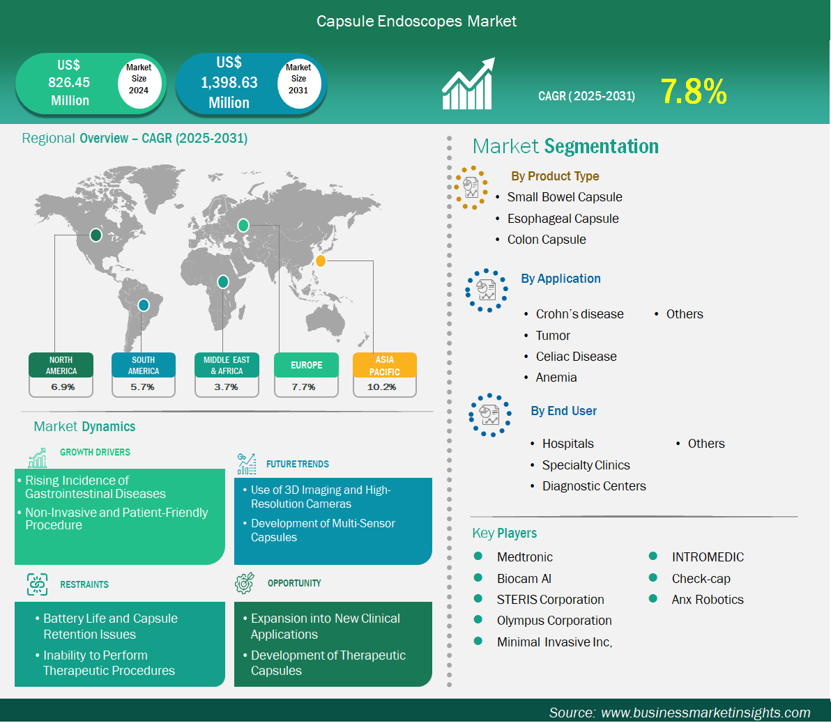 The capsule endoscopes market is likely to grow as a non-invasive tool to check the gastrointestinal tract parts that regular endoscopes struggle to reach. Capsule endoscopy requires patients to swallow a tiny, pill-sized camera that takes pictures as it moves through the digestive system. This method helps to spot diseases such as Crohn's disease, GI bleeding, and small intestine tumors. The market expands due to more people knowing about less invasive tests, a rise in GI problems, and better technology for image quality and battery life.