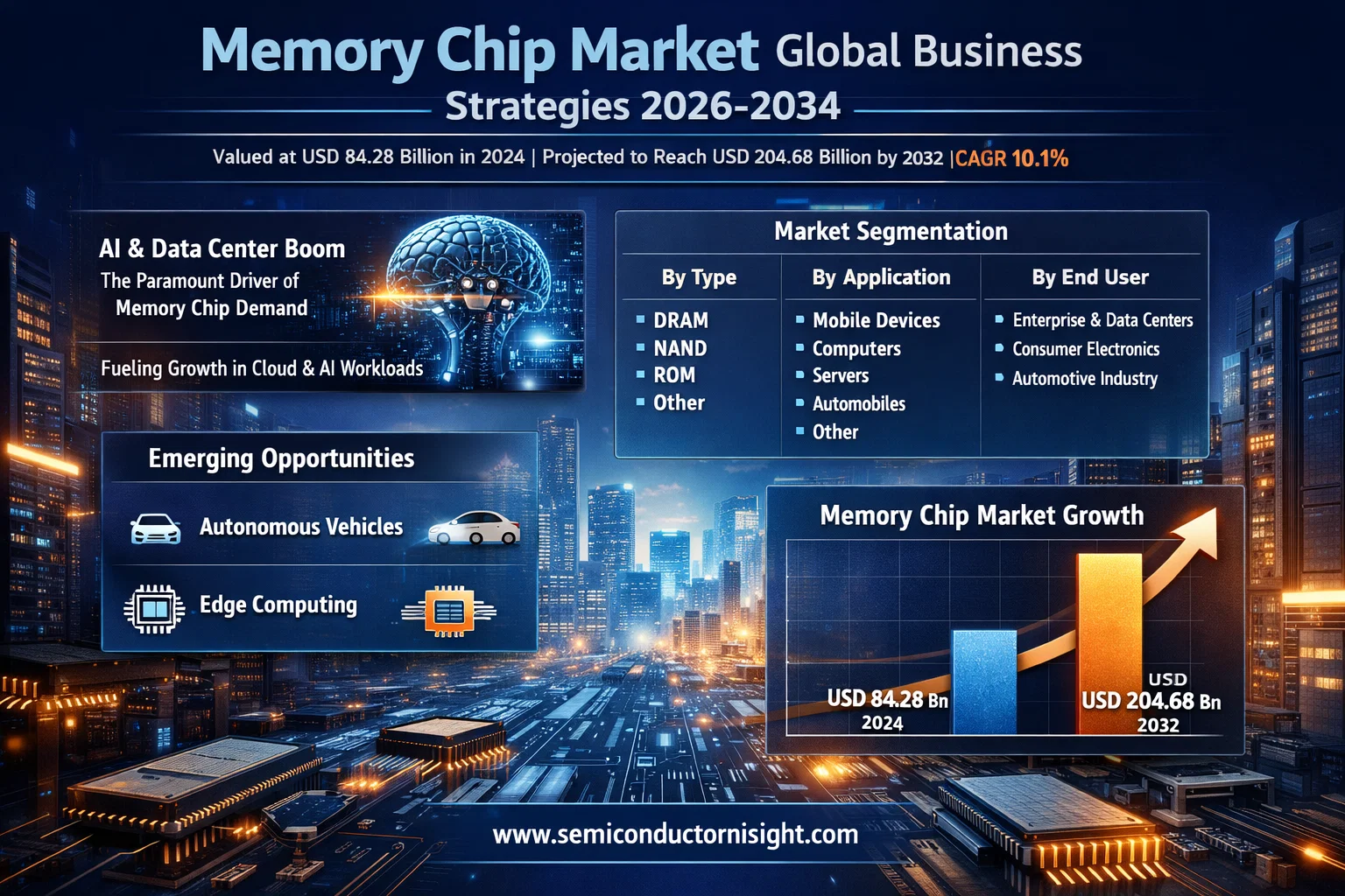 Memory Chip Market, valued at a robust USD 84.28 billion in 2024, is on a trajectory of significant expansion, projected to reach USD 204.68 billion by 2032. This growth, representing a compound annual growth rate (CAGR) of 10.1%, is detailed in a comprehensive new report published by Semiconductor Insight. The study highlights the foundational role of memory chips as the essential storage and working memory for virtually all modern electronic devices.