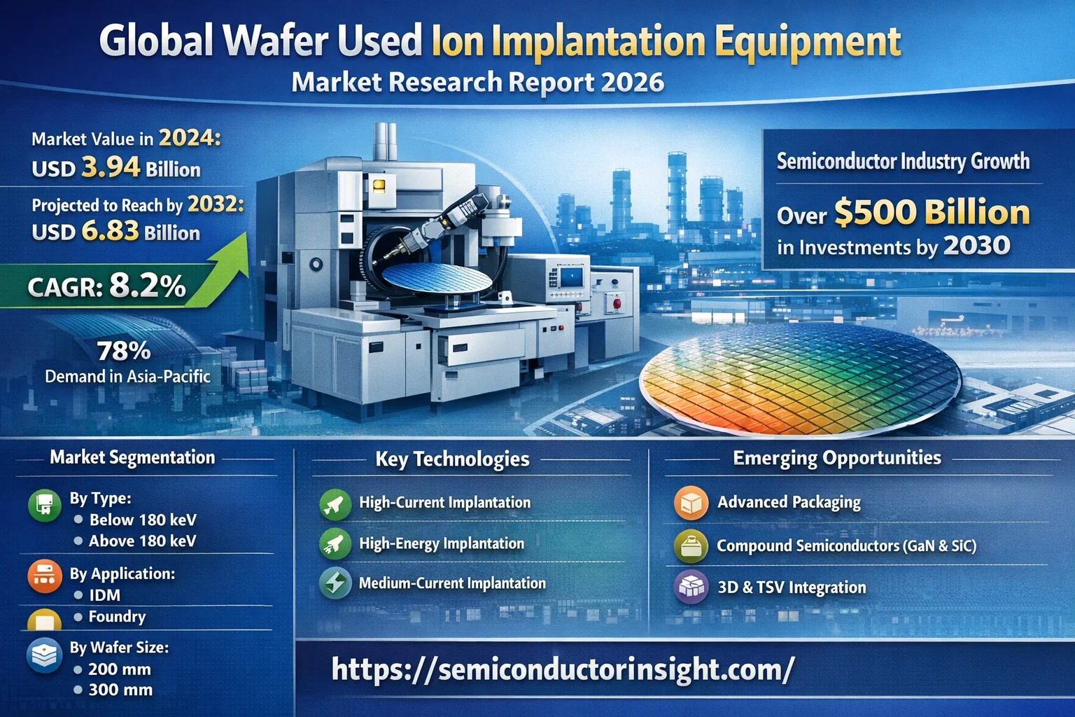 Wafer Used Ion Implantation Equipment Market, valued at USD 3.94 billion in 2024, is poised for substantial growth, projected to reach USD 6.83 billion by 2032. This expansion, representing a compound annual growth rate (CAGR) of 8.2%, is detailed in a comprehensive new report published by Semiconductor Insight. The study underscores the critical role of ion implantation equipment in semiconductor manufacturing, enabling precise doping processes essential for creating advanced integrated circuits.