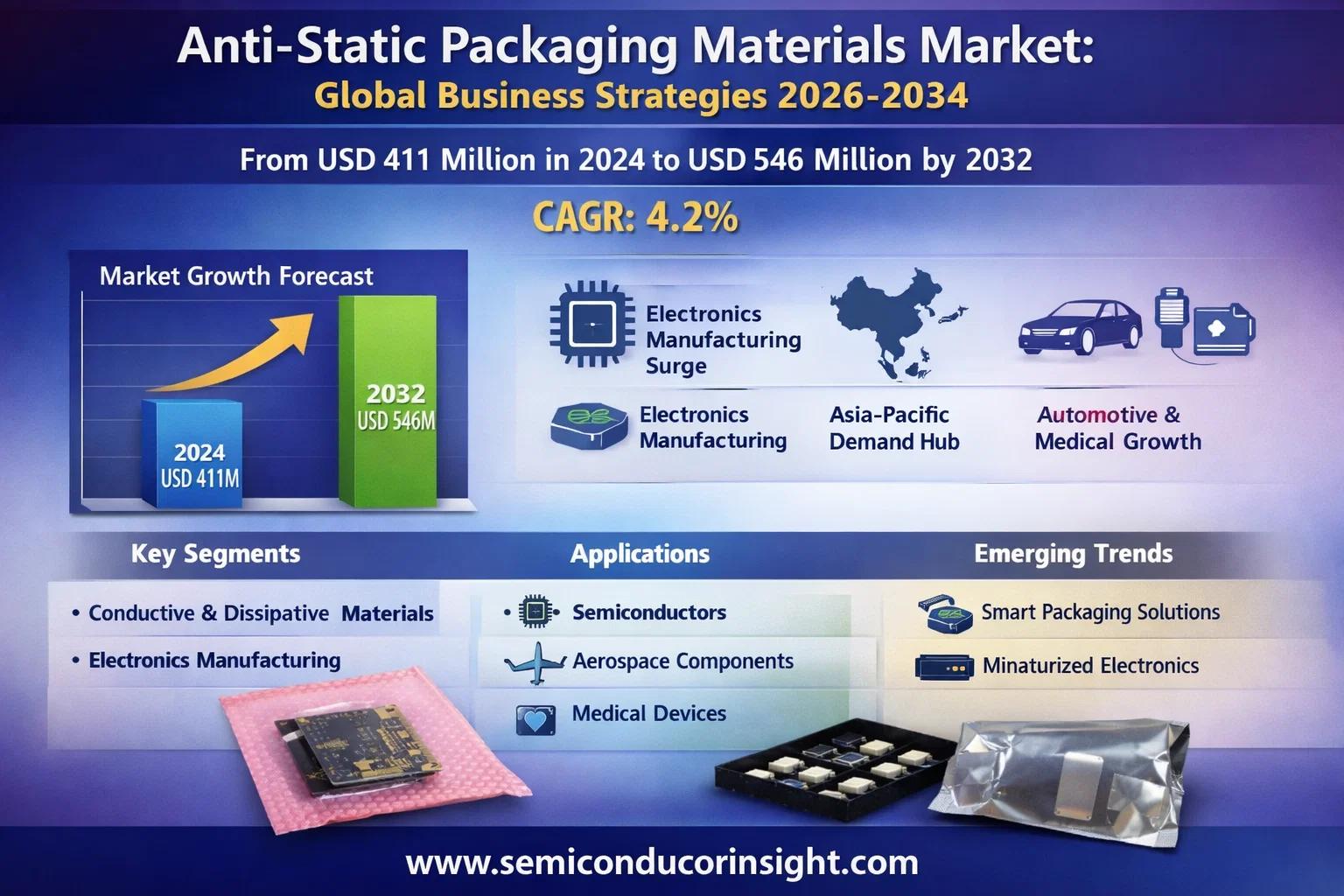 The report pinpoints the accelerated growth of the global electronics manufacturing sector as the primary catalyst for anti-static packaging demand. With the electronics industry segment representing the majority of market applications, the relationship between sector growth and packaging requirements remains direct and substantial. The semiconductor manufacturing industry itself continues its impressive expansion, creating sustained demand for protective packaging solutions.