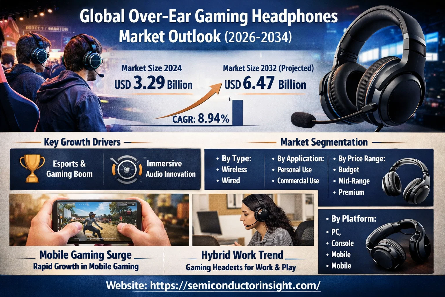 Global Over-ear Gaming Headphones Market, valued at a substantial USD 3.29 billion in 2024, is positioned for remarkable expansion, projected to reach USD 6.47 billion by 2032. This robust growth, representing a compound annual growth rate (CAGR) of 8.94%, is detailed in a comprehensive new report published by Semiconductor Insight. The study underscores the critical role of immersive audio solutions in enhancing the gaming experience, driven by technological advancements and the booming global gaming culture.