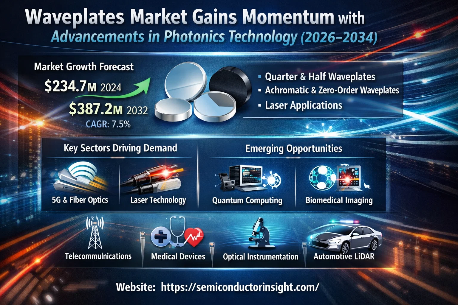 Global Waveplates Market, valued at USD 234.7 million in 2024, is poised for substantial growth, projected to reach USD 387.2 million by 2032. This expansion, representing a compound annual growth rate (CAGR) of 7.5%, is detailed in a comprehensive new report published by Semiconductor Insight. The study underscores the critical role these precision optical components play in controlling light polarization across advanced technological applications, from telecommunications to medical devices.