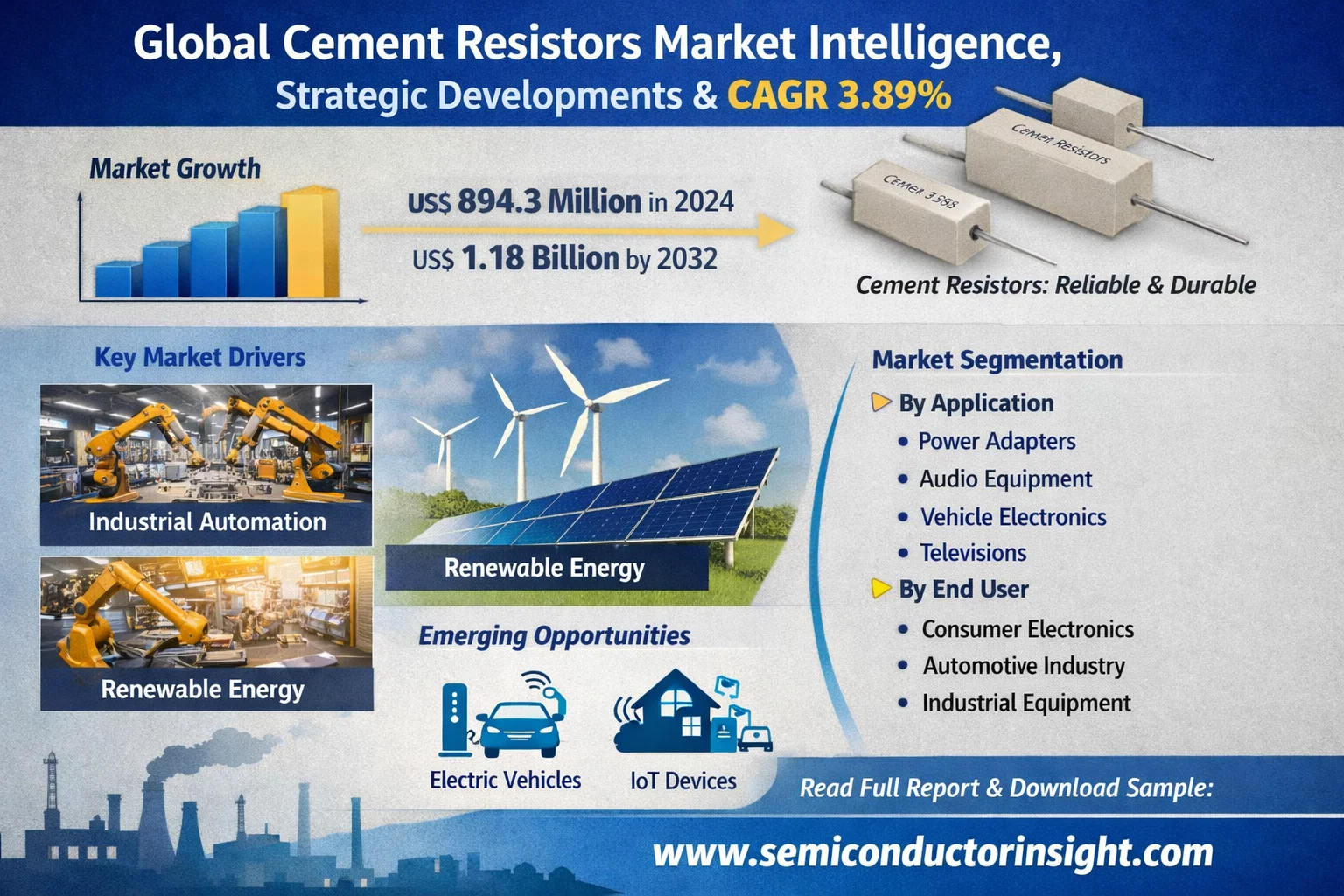 global Cement Resistors Market, valued at USD 894.3 million in 2024, demonstrates steady growth projections to reach USD 1.18 billion by 2032. This expansion, representing a compound annual growth rate (CAGR) of 3.89% during the forecast period 2025-2032, is detailed in a comprehensive new report published by Semiconductor Insight. The study emphasizes the indispensable role of these robust passive components in providing reliable current limiting and voltage division across diverse electronic applications, particularly where high power dissipation and environmental stability are paramount.