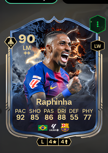 Raphael Dias Belloli's Thunderstruck card stands out as a dynamic Left Midfielder with an impressive overall rating of 90, making him a formidable presence on the pitch. Boasting remarkable pace at 92, sharp dribbling skills rated at 88, and strong shooting and passing ratings of 85 and 86 respectively, this card captures the essence of a top-tier attacking winger. With these attributes, Belloli is perfectly equipped to slice through opposing defenses, create goal-scoring opportunities, and deliver decisive plays that can turn the tide of any match in your favor.