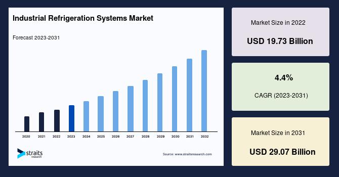 Straits Researchの最新の分析によると、世界の産業用冷凍システム市場は2022年に197億3000万ドルと評価され、2031年までに290億7000万ドルに達すると予測され、予測期間中に4.4%のCAGRで成長しています。