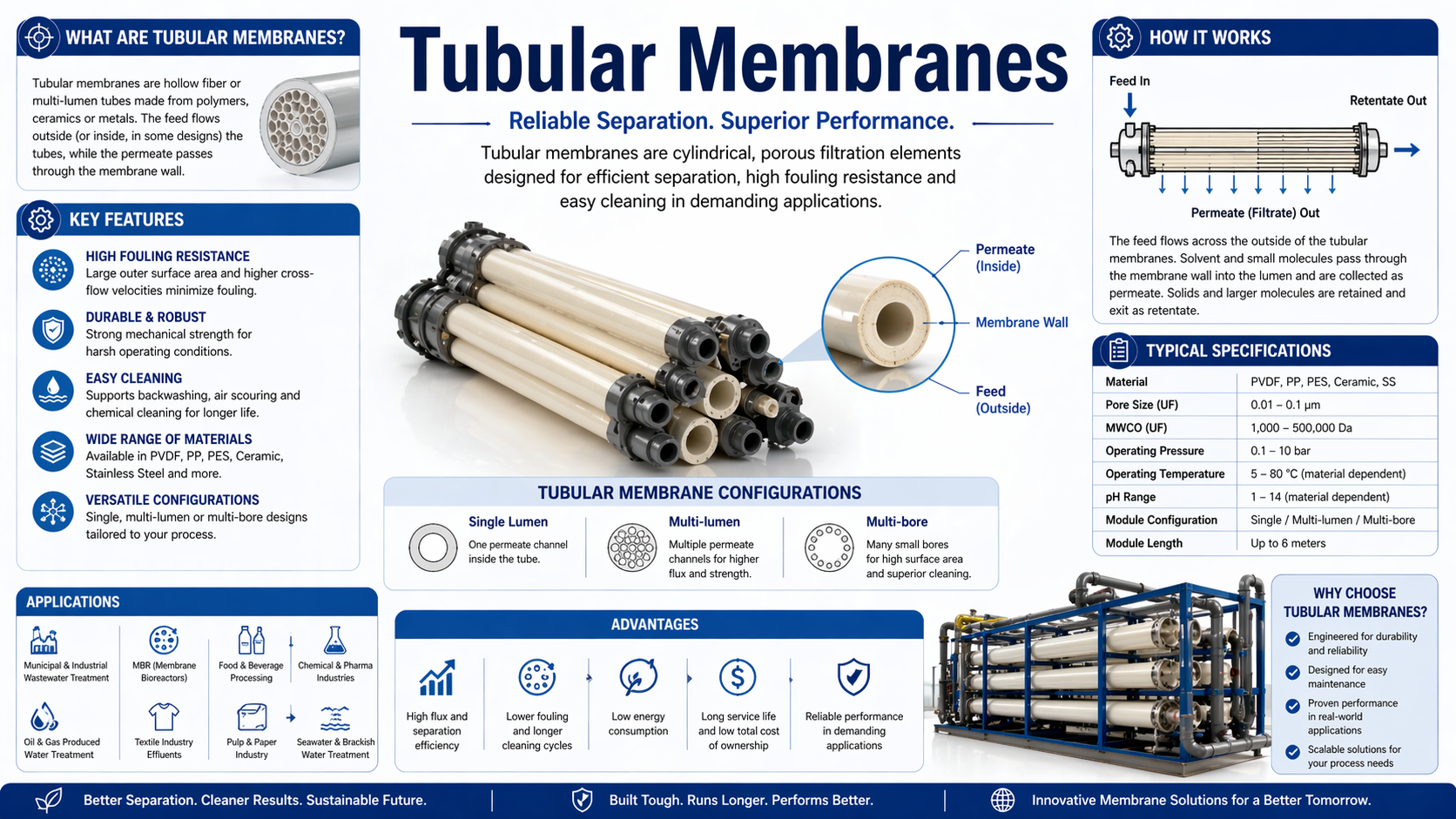 Tubular membranes are advanced cylindrical filtration systems designed to efficiently separate suspended solids, microorganisms, and contaminants from liquid streams. These systems are widely applied in wastewater treatment, chemical processing, pharmaceuticals, food and beverage production, and industrial water recycling due to their high fouling resistance, durability, and ability to handle complex high solid content fluids.