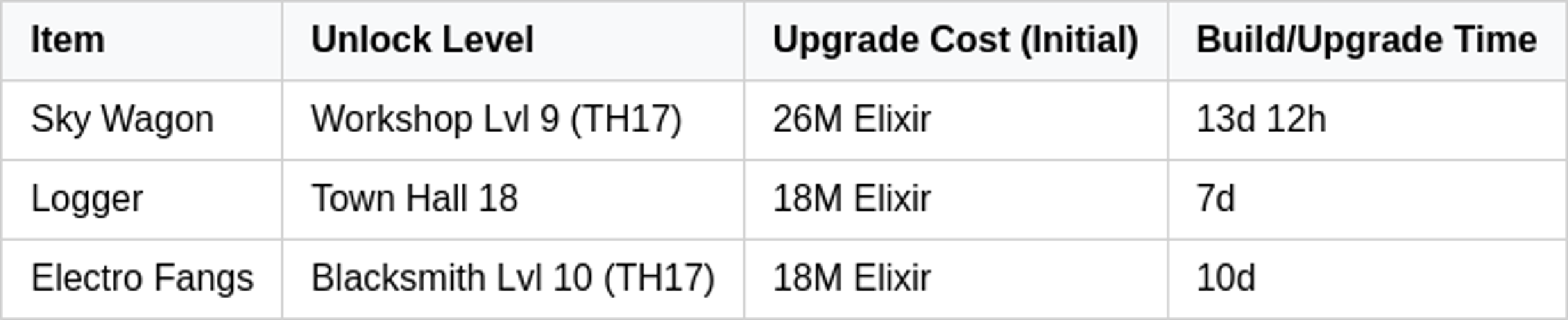 Sky Wagon — a new aerial siege machine — arrives at Town Hall 17 once the Workshop is upgraded to level 9.