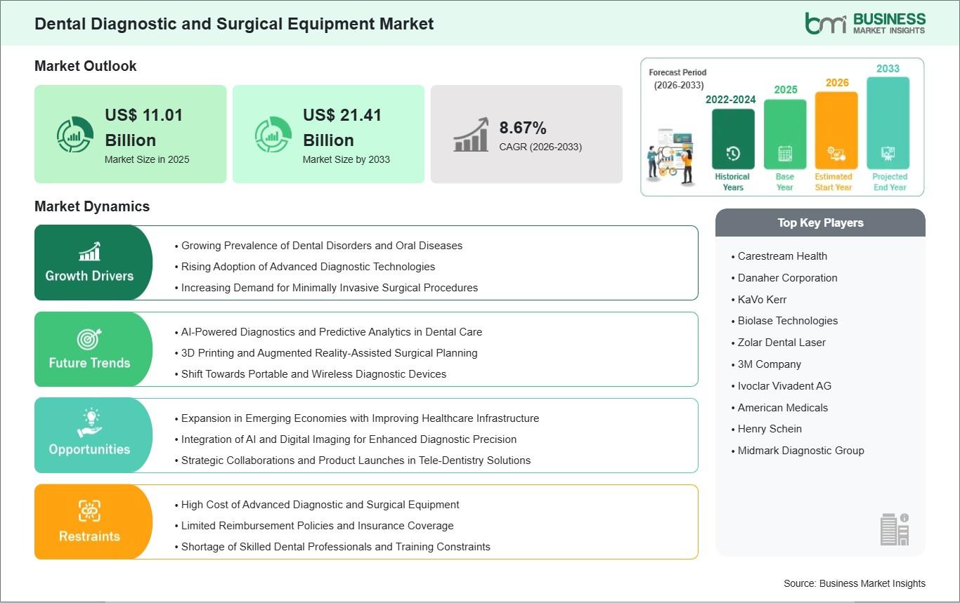 According to market estimates, the global dental diagnostic and surgical equipment market is projected to grow from US$ 11.01 billion in 2025 to US$ 21.41 billion by 2033, registering a CAGR of 8.67% during 2026–2033. This growth trajectory highlights the increasing adoption of advanced dental technologies across developed and emerging economies. The market is also benefiting from the expansion of dental clinics, rising disposable income, and the growing trend of cosmetic dentistry worldwide.