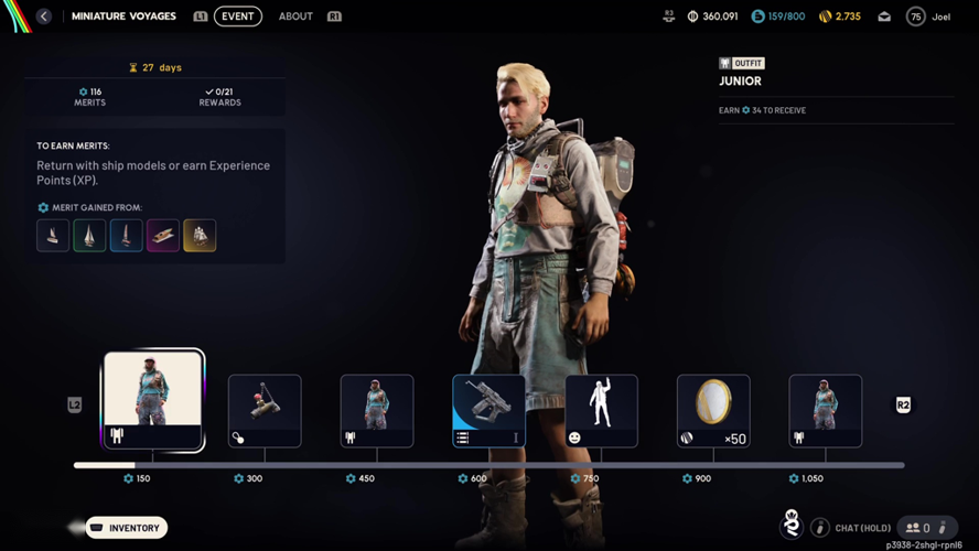Miniature Voyages progression — 21 unlocks grouped by type (merit cost shown).