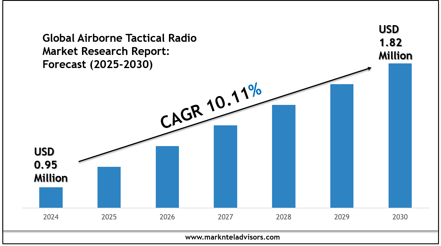 The Airborne Tactical Radio Market size was valued at around USD 0.95 million in 2024 and is projected to reach USD 1.82 million by 2030. Along with this, the market is estimated to grow at a CAGR of around 10.11% during the forecast period, i.e., 2025-30. The main reasons behind this growth are the increased defense expenditures, rising geopolitical conflicts, advancements in communication systems, growing demand for advancements in the avionics of the fighter aircraft, high demand for conveying information securely amid a rise in electronic warfare systems, and adoption of interoperable devices.