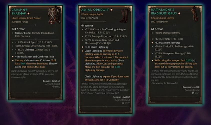 Additionally, chaos armor pieces boast enhanced attributes compared to their standard versions. They always appear with maximum possible power levels and include at least one superior affix, making them highly sought after in gameplay.