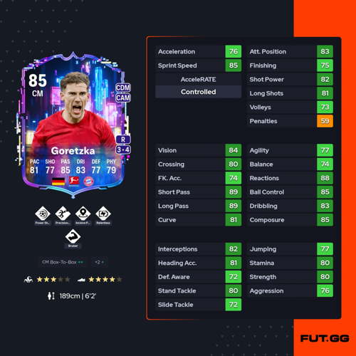 Pour exploiter pleinement le potentiel de Goretzka, il vaut mieux opter pour une version plus offensive que sa carte rare, selon le rôle que vous souhaitez lui donner dans votre équipe. Ce n’est pas une nécessité absolue, mais c’est une option intéressante si vous cherchez une carte plus performante. Cependant, son coût reste élevé par rapport à sa version rare, ce qui peut influencer votre décision.