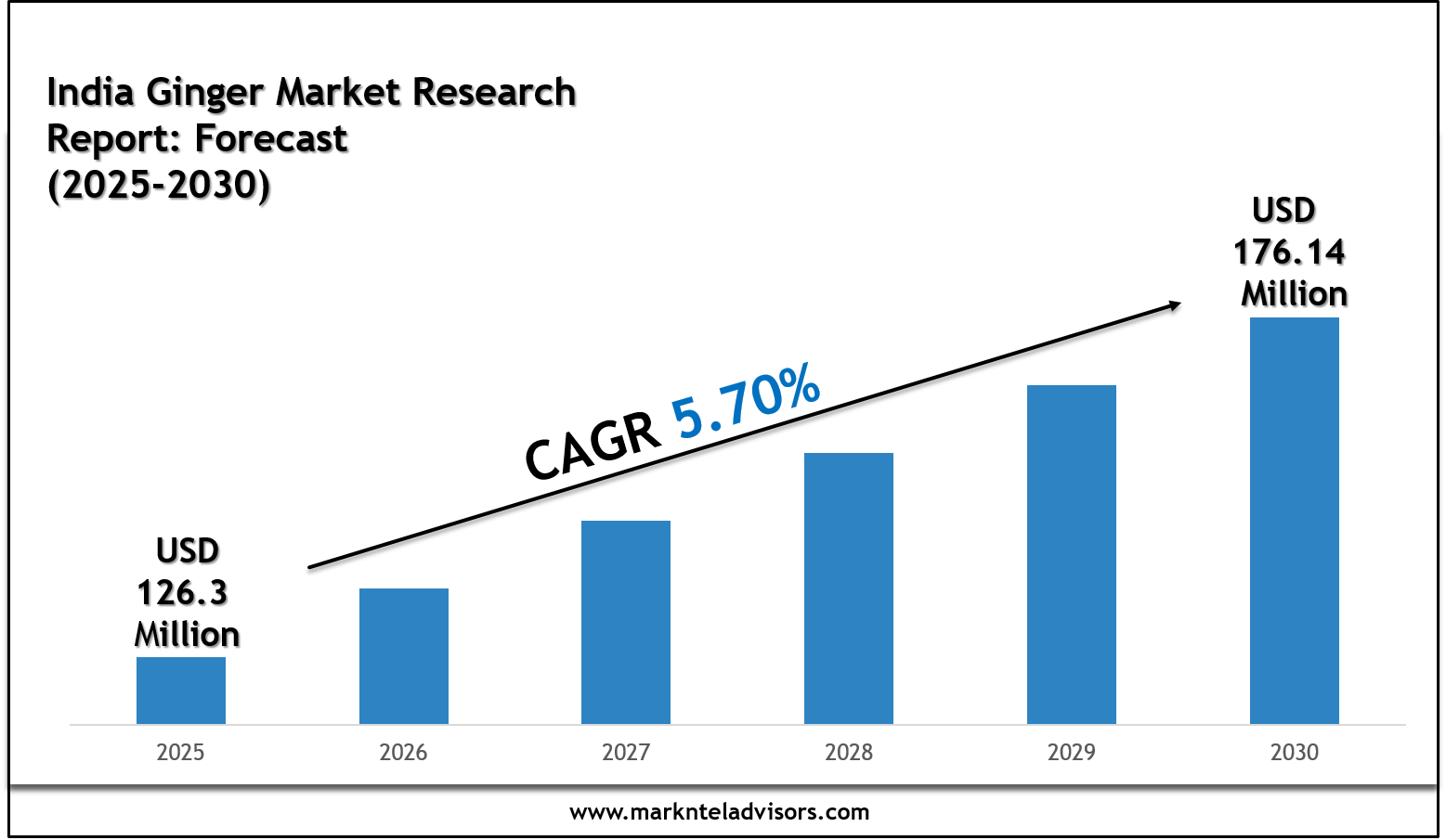 The India Ginger Market size is valued at around USD 126.3 million in 2025 and is expected to reach USD 176.14 million by 2030. Along with this, the market is estimated to grow at a CAGR of around 5.70% during the forecast period, i.e., 2025-30. The India Ginger Market is significantly growing due to several growth factors, including the high local cultivation & production of ginger in the country, the rising support by the Indian government, the increasing demand from the cosmetics sector, the growing infusion of ginger in nutraceutical products, the adoption of ginger-based beverages, and many more.