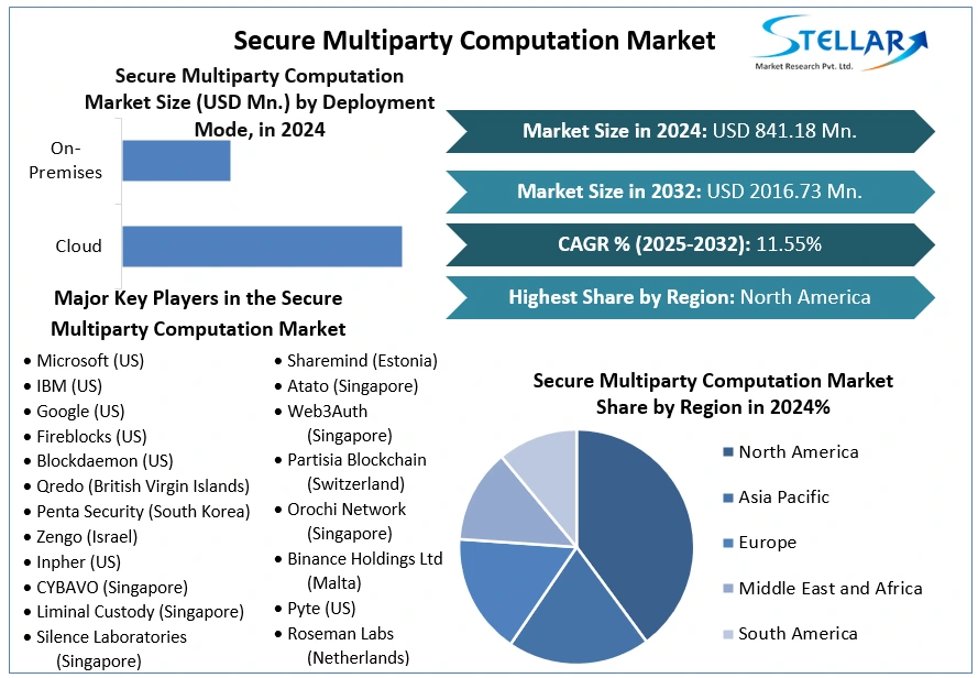 The Secure Multiparty Computation (SMPC) Market is rapidly emerging as a critical pillar in the global cybersecurity and privacy landscape. As data volumes surge and industries seek to leverage shared insights without exposing sensitive information, SMPC — a cryptographic protocol that enables multiple parties to jointly compute functions over private data without revealing their individual inputs — is gaining traction across sectors such as finance, healthcare, IT, government, and beyond. According to recent industry analysis, the global market was valued at around USD 841.18 million in 2024 and is projected to expand to nearly USD 2,016.73 million by 2032, growing at a CAGR of approximately 11.55% during the forecast period.